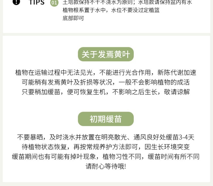 本店所有植物受季节影响,每个季节植物外观不同,如果要求比较高,请下单前联系客服可以看下植物现状,没有联系默认接受植物自然生长情况,如果收到有问题,及时拍照联系客服.