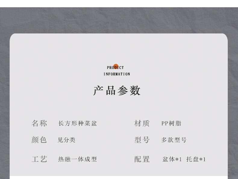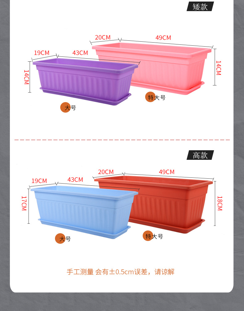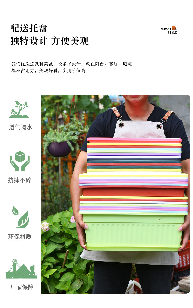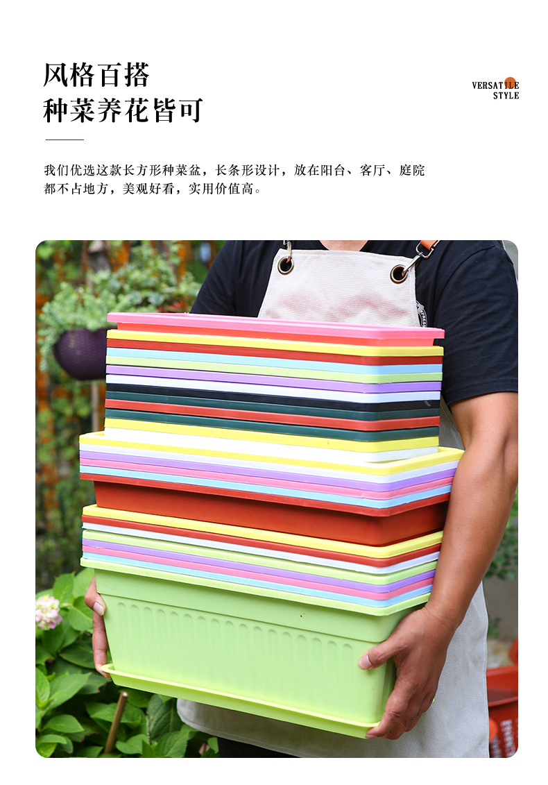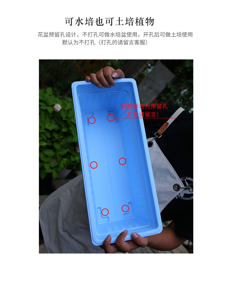 本款长方形种植菜盆生产时【大号特大号】普通款是无孔的;为了方便买家回去打漏水孔麻烦;我们发货前会默认打孔发货;如果有不需要打孔的买家;跟客服联系留言备注不打孔发货;感谢亲的理解与支持谢谢!!!