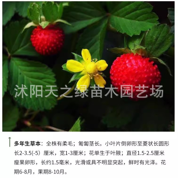 商品描述 蛇莓 学名:Duchesnea indica (Andr.) Focke 别名:蛇泡草、龙吐珠、三爪风、鼻血果果、珠爪、果、鸡冠果野草莓、蛇藨、地莓、蚕莓、三点红、狮子尾、疗疮药、蛇蛋果等 多年生草本,全株有柔毛,匍匐茎长。花期6-8月,果期8-10月 多野生于山坡、草地上、路旁、沟边或田埂杂草中,全国各地都有分布 种子直播,发芽温度15-25度,不盖土,发芽率低,通常低于10% ![]() ![]() ![]() ![]() ![]() ![]() ![]() ![]() ![]() ![]() ![]() ![]() ![]() ![]() ![]() ![]()