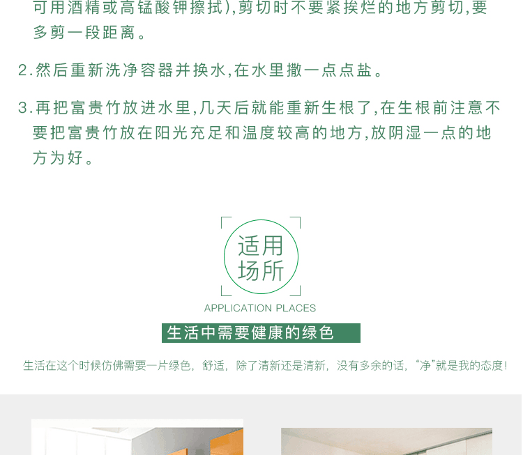 收到富贵竹不要马上插入瓶子里面,低于瓶口的叶子全部剪掉,根部以45度角剪斜边,瓶子里面的水只留15cm就好,刚买回来的富贵竹换一边水,长根之后十天换一边水,如果亲们发现富贵竹有黄叶的情况 水里放2根铁钉就可以了。