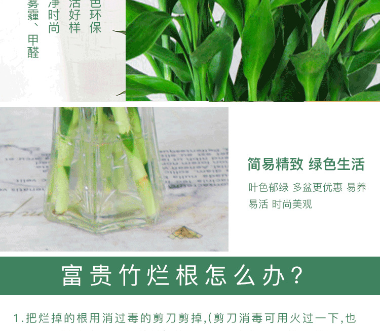 收到富贵竹不要马上插入瓶子里面,低于瓶口的叶子全部剪掉,根部以45度角剪斜边,瓶子里面的水只留15cm就好,刚买回来的富贵竹换一边水,长根之后十天换一边水,如果亲们发现富贵竹有黄叶的情况   水里放2根铁钉就可以了。