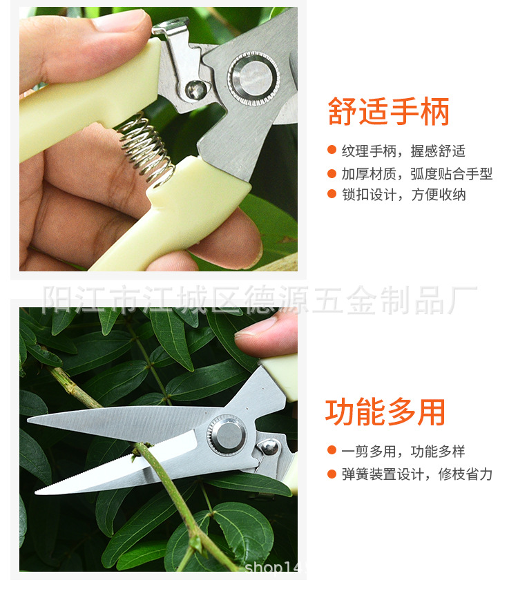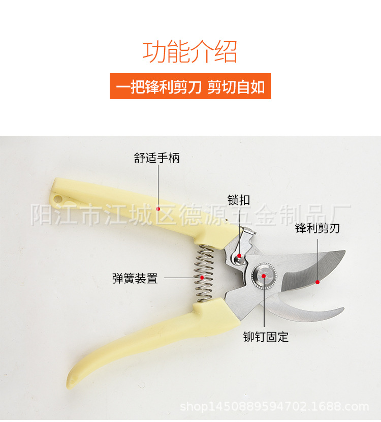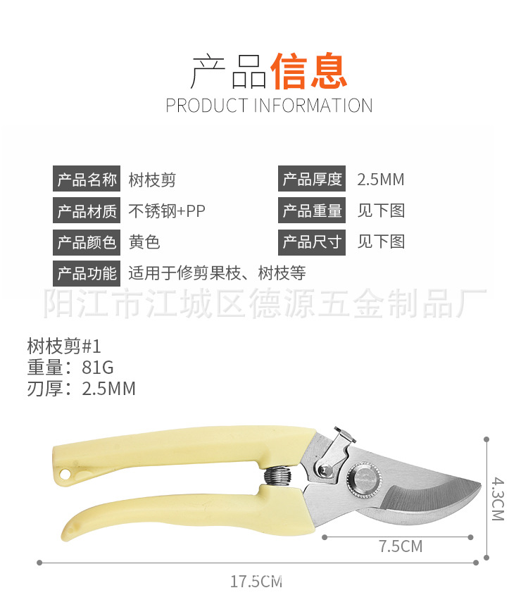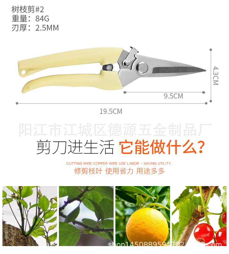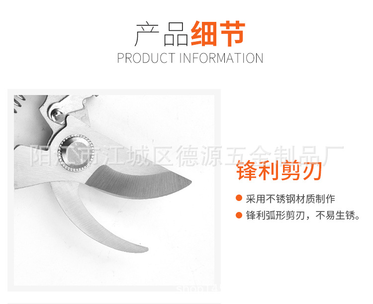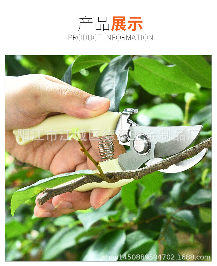 商品描述 【名 称】DY-H3014修枝剪刀 【规 格】H3014(直口):总长约:17.5cm,宽4.3cm,厚2.5mm,重量:约83G, H3014(弯口):总长约:19.5cm,宽4.3cm,厚2.5mm,重量:约87G, 【材 料】不锈钢3cr13 手柄:PP. 【颜 色 】白色. 【用 途】剪小树枝、修花枝、修叶径、等(剪枝径直径0.1-5mm以下). 【包 装】简装(默认包装),可订制插卡. 【注意事项】 1.不宜剪切硬物及强行剪切 2.接触酸碱盐类物质后应及时清洗擦干 3.剪柄切勿靠近高温 【 温馨提示】 1.本厂的产品部分有现货(现货产品的质量、工艺、包装等以实样为准)价格是按出厂价批发,不含税价不含运费;如大件货需发快运或物流请与客服联系(运费要看具体地方,具体重量或体积不同而再报价),小包裹系统默认是中通快递; 2.买家在拍下商品之前,请咨询好交货的时间、价格、颜色,工艺等产品相关资料后,再提交订单; 3.订制的商品是按客户的样品规格、颜色、工艺、包装生产,如非质量问题不可退货,还望谅解; 4.本厂部分产品是现货,买家付款如是现货产品可在3天内发货,因特殊原因延期发货会另通知客户;如是订制的产品或订制包装请与业务人员协商好拍下订单,谢谢理解与支持!
